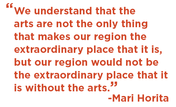 ArtsFund President & CEO Mari Horita mused on the power of the arts to connect people through the creation of emotional bonds and social networks, saying, “the arts are one of the forces that can help transcend conventional differences and renew positive social behaviors and connections.” Mari added, “We understand that the arts are not the only thing that makes our region the extraordinary place that it is, but our region would not be the extraordinary place that it is without the arts.”