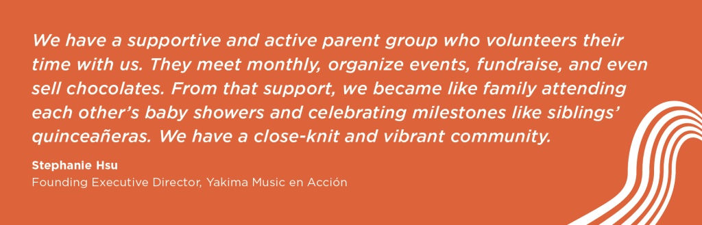 Mission: Yakima Music en Acción (YAMA) grows confident young leaders throughout the neighborhoods it serves by widening access to professional-level music learning, igniting collective pride, and empowering and unifying students and families.