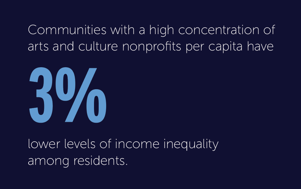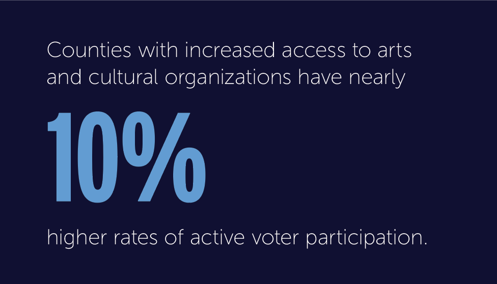 Our research demonstrates significant correlations between an accessible and well-funded arts and culture landscape and a vibrant community overall. We found that people living in Washington communities with many cultural resources are MORE CONNECTED, MORE INVOLVED in helping their communities, and have MORE ECONOMIC OPPORTUNITIES. We also found that positive economic connections to arts resources, like funding, have even STRONGER OUTCOMES IN RURAL COMMUNITIES. The positive relationship holds in all the findings, even when controlling for community characteristics like income level, education level, and urban/rural geography. The LIS shows that building and maintaining a healthy arts and culture sector is a tool that can be used to create a better quality of life with statistically significant outcomes for all Washingtonians.