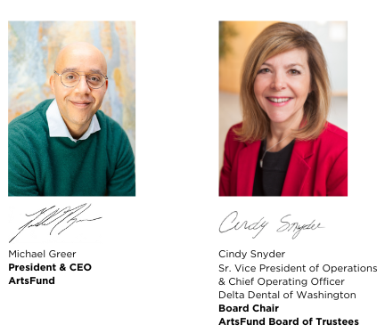 It is because of the support of this community that we can continue our work. Whether it is our corporate partners, our institutional partners, or our individual partners, ArtsFund remains dedicated to leveraging those partnerships into initiatives that further our mission to support the arts through leadership, advocacy, and grantmaking in order to build a more healthy, equitable, and creative Washington.
