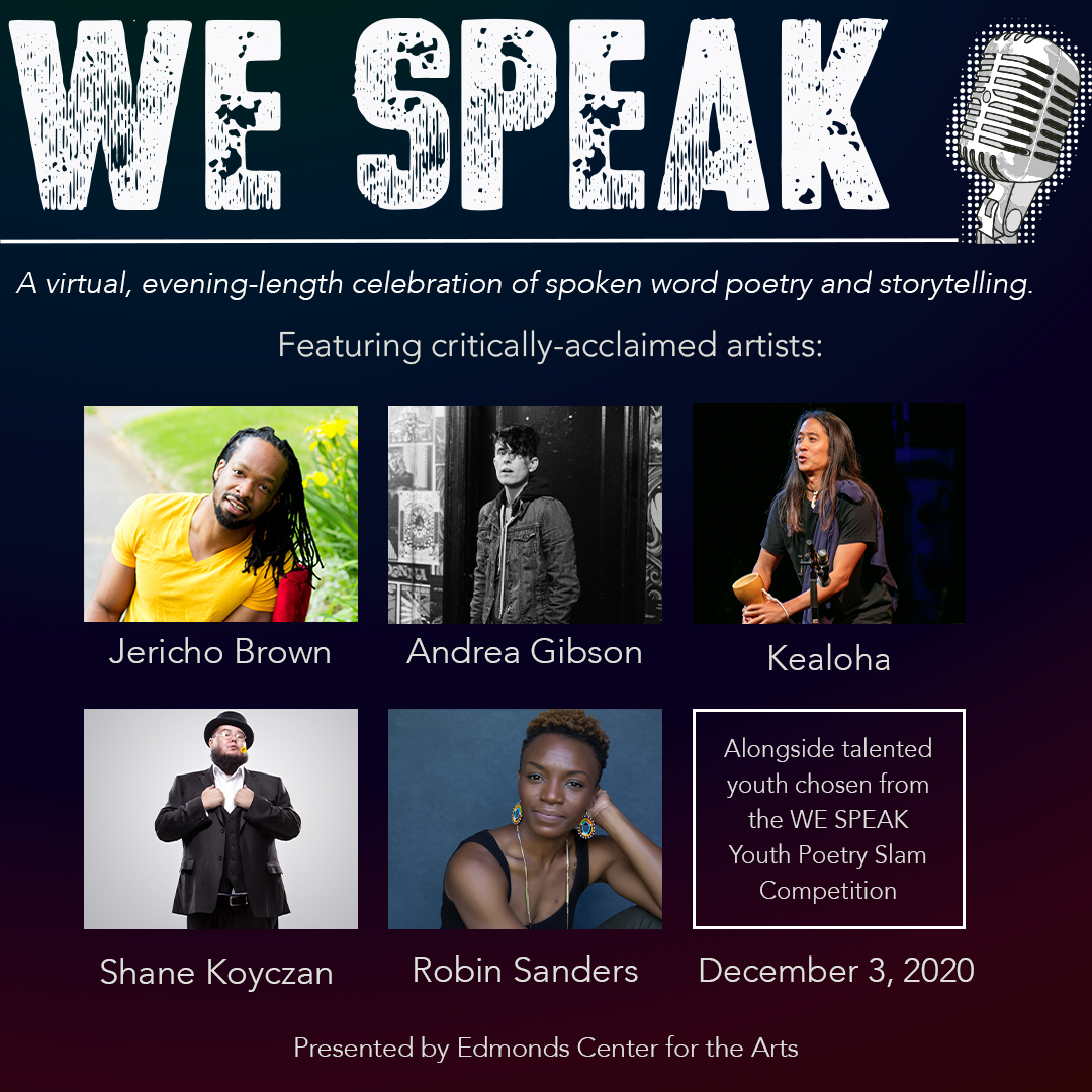 A virtual, evening-length celebration of spoken word poetry and storytelling. Integrating critically-acclaimed artists Jericho Brown, Andrea Gibson, Kealoha, Shane Koyczan, and Robin Sanders, alongside talented local youth chosen through a juried selection process, WE SPEAK seeks to embody the complex themes and concerns of the year 2020. Through performance, artists are invited to respond to issues including (but not limited to) the global health crisis, Black Lives Matter and the racial justice movement, and experiences of disability, Indigenous, and LGBTQ+ communities. Their voices call for action, dignity, and, ultimately hope.