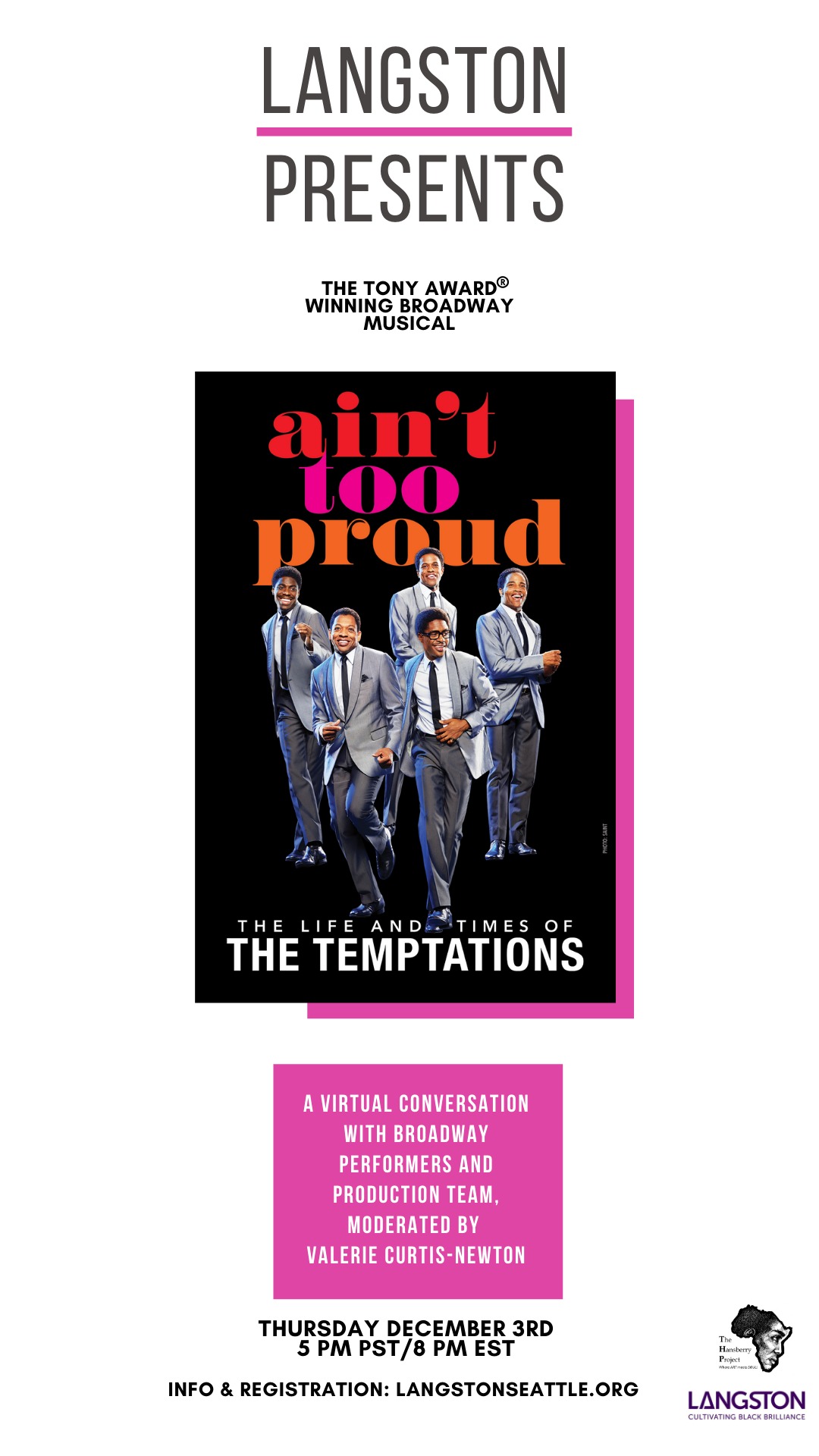 A discussion with the cast and crew of The Tony Award® Winning Broadway Musical AIN’T TOO PROUD: The Life and Times of the Temptations, moderated by Valerie Curtis-Newton, Artistic Director, The Hansberry Project. Join this unique opportunity for Seattle’s Black theater community to engage in a candid discussion about the obstacles, challenges and rewards of working in the Broadway theater world with veterans of the field. Requires registration.